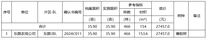 受海垦控股集团下属东路农场公司委托,海胶集团2024年第42批林木网上竞价为东农场公司投放标的1个,面积35.9亩、株数466株、材积153.6立方米(详见附表)。该信息发布于海南农垦信息网、海胶集团官网和海胶集团木材竞价交易平台(http://mcjj.hirub.cn/ )欢迎竞价会员报名参加竞价。
