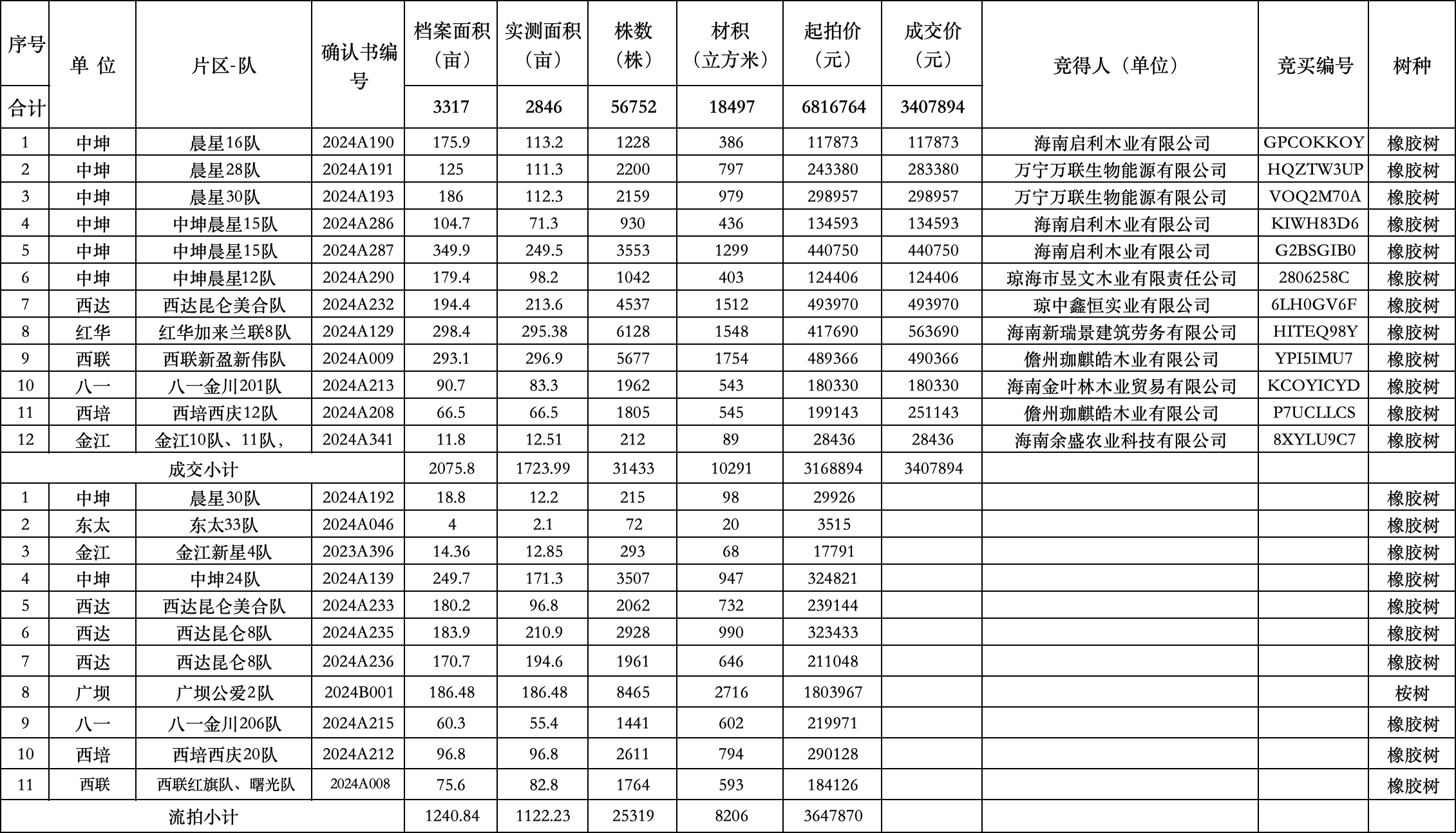 海胶集团今年第39批林木网上竞价于2024年8月23日结束,此次放标23个,成交12个,流拍11个。详情如下: