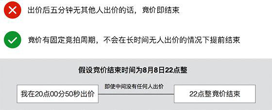 很多客户把延时周期理解为五分钟无其他人出价的话,竞价即结束。这样的理解是错误的哦,竞价有固定的竞价周期,不会在长时间无人出价的情况下提前结束。