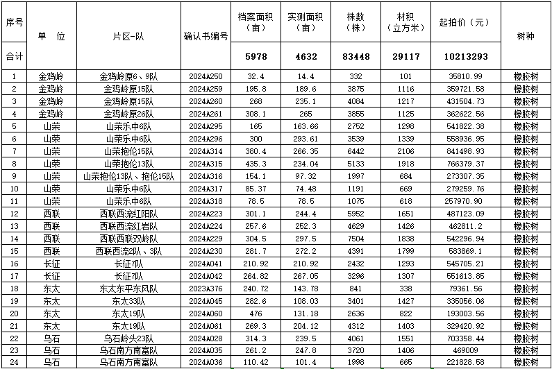2024年海胶集团第41批林木网上竞价标的共24,档案面积5978亩、株数83448株、材积29117立方米(详见附表)。该信息发布于海南农垦信息网、海胶集团官网和海胶集团木材竞价交易平台(http://mcjj.hirub.cn/ )等,欢迎竞价会员报名参加竞价。