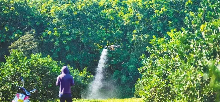 7月25日,澄迈县福山镇,海南橡胶红光分公司智能标准化澄迈福橙种植基地,伴随着螺旋桨转动的嗡嗡声,一台无人机满载生物防虫剂缓缓升空,按照预设航线在福橙园上空来回穿梭。